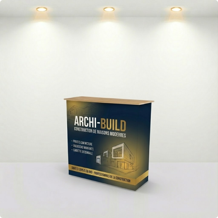 Ce comptoir est entièrement personnalisable. Il sera idéal pour accueillir vos clients et prospects sur un salon professionnel ou à placer dans un showroom.
